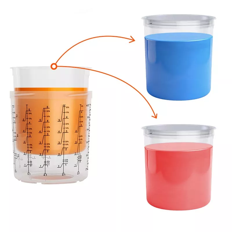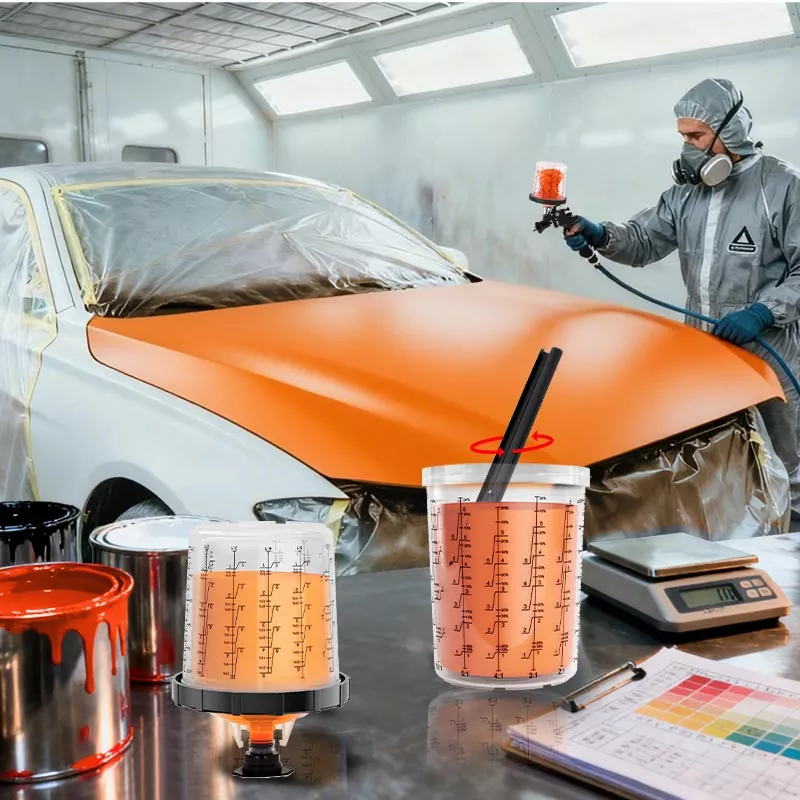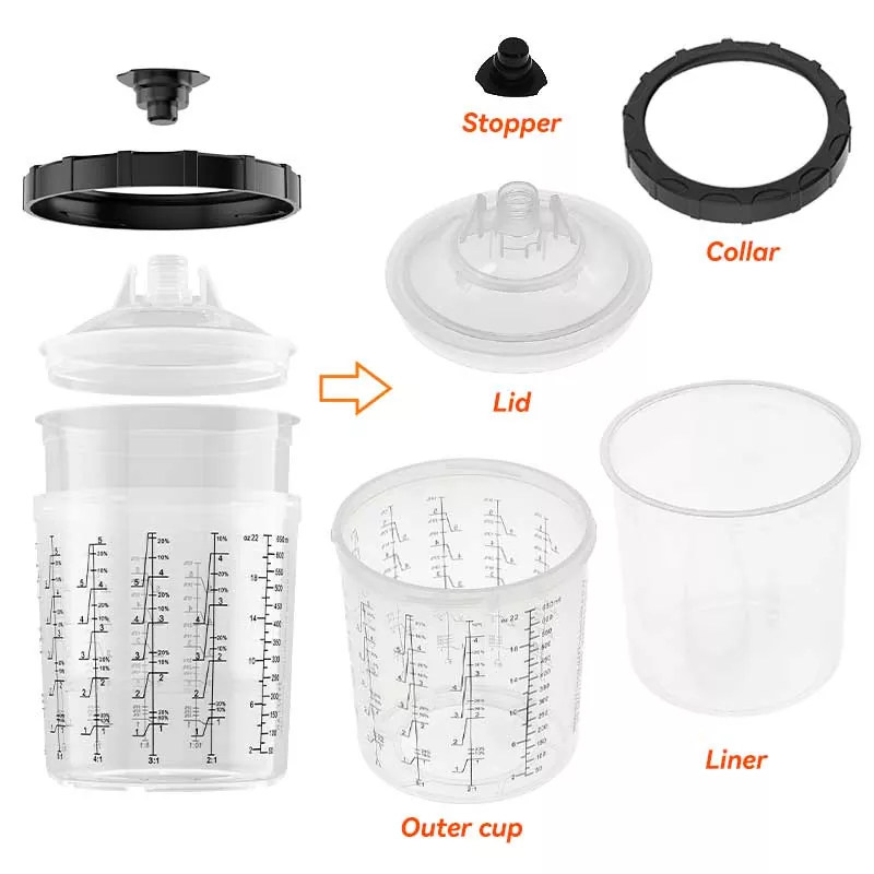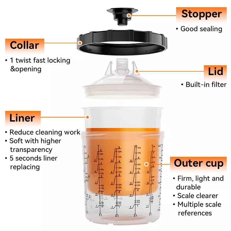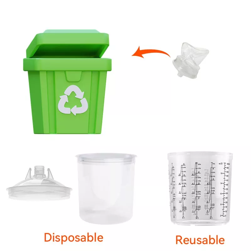Систем чаша за једнократну употребу комбинује функције мешања, филтрирања, прскања и складиштења у једној јединици. Ово не само да поједностављује припрему пред фарбање, већ и штеди трошкове мешања чаша и левка за папир, што их чини савршеним избором за уштеду времена припреме и побољшање ефикасности прскања.