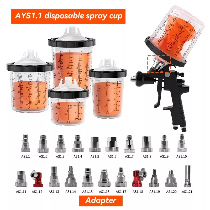 Чаша за распршивање АИС1.1 за једнократну употребу је компатибилна са адаптером серије ППС1.0. Са адаптером, може се савршено прилагодити било којој марки пиштоља за прскање и може се користити у било ком положају без ризика од капања боје.