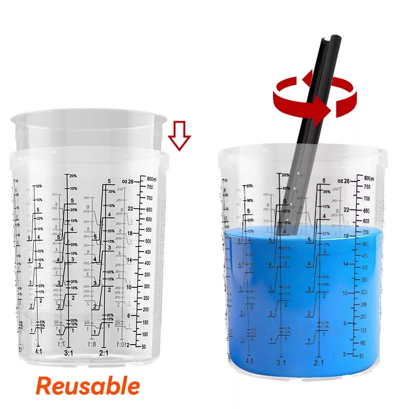 Спољна чаша за вишекратну употребу са скалом односа мешања. Уметните подлогу за једнократну употребу у спољашњу чашу и помешајте боју директно у кошуљицу. Смањите трошкове материјала тако што не користите традиционалну чашу за мешање.